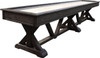 The Brazos River shuffleboards are part of the Fairfield Collection of game tables by Playcraft. The Brazos trestle leg design and hand finishing is inspired by old world styling and craftsmanship. Distressed Weathered Black finish that appears to have been reclaimed from a century old countryside barn, the Brazos is certain to make a statement. More than just beautiful furniture, the high quality materials and construction will ensure many years of high quality shuffleboard with family and friends. The shuffleboard playfield logo style and/or position may vary. Also available in matching 8' slate pool tables.